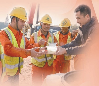 浙江省湖州市長(zhǎng)興縣泗安鎮(zhèn)東村村干部為高速改擴(kuò)建項(xiàng)目施工人員送餃子。