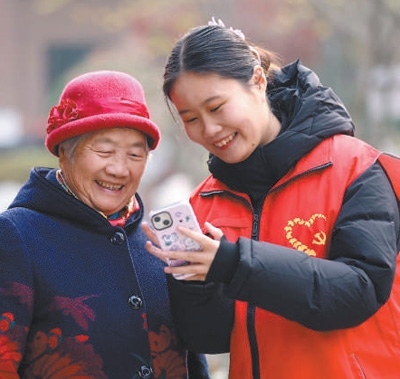 山東省臨沂市郯城縣郯城街道泉悅社區(qū)干部為老年居民介紹智能手機(jī)應(yīng)用的使用方法。