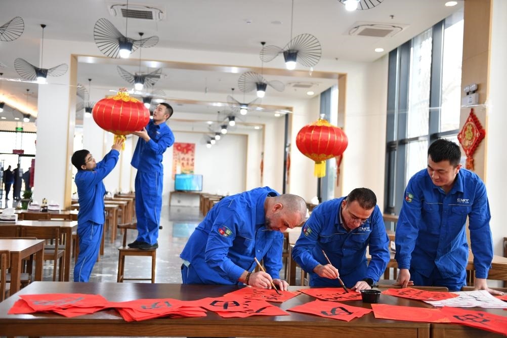 1月23日,在伊拉克米桑油田,中海石油伊拉克有限公司中外員工一起寫(xiě)春聯(lián),掛燈籠。新華社發(fā)