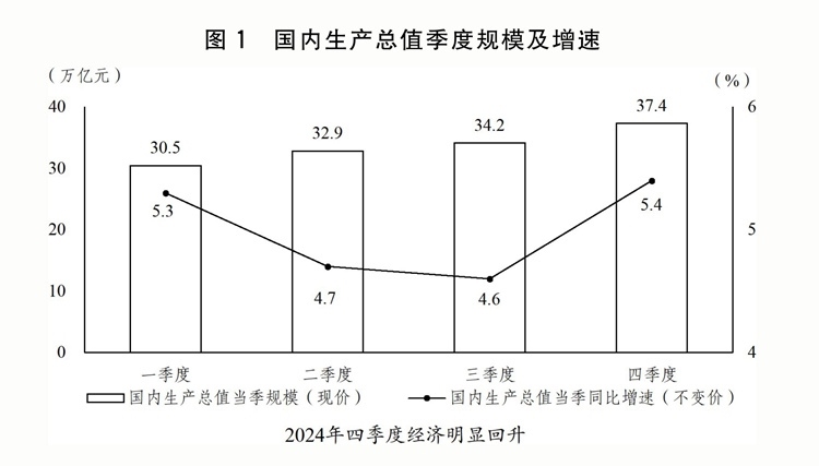 (一)因時(shí)因勢加強(qiáng)和創(chuàng)新宏觀調(diào)控,推動經(jīng)濟(jì)回升向好。扎實(shí)開展宏觀政策逆周期調(diào)節(jié),加大政策力度,釋放政策效能,特別是9月26日中央政治局會議果斷部署一攬子增量政策,市場預(yù)期、社會信心有效提振,四季度經(jīng)濟(jì)明顯回升。全年國內(nèi)生產(chǎn)總值(GDP)134.9萬億元、增長5%,其中,一、二、三產(chǎn)業(yè)分別增長3.5%、5.3%、5%。