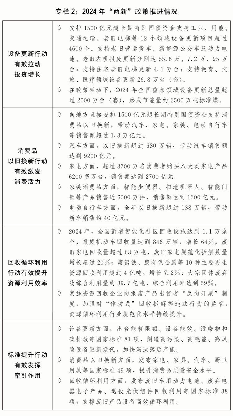 四是加力擴(kuò)圍實(shí)施“兩新”政策。安排超長期特別國債5000億元支持大規(guī)模設(shè)備更新和消費(fèi)品以舊換新,統(tǒng)籌投資、財(cái)政、金融等綜合性政策,深入推進(jìn)設(shè)備更新、消費(fèi)品以舊換新、回收循環(huán)利用、標(biāo)準(zhǔn)提升四大行動。進(jìn)一步加大重點(diǎn)領(lǐng)域設(shè)備更新項(xiàng)目支持力度,加力實(shí)施設(shè)備更新貸款貼息,加快存量設(shè)備評估診斷和項(xiàng)目儲備。進(jìn)一步支持消費(fèi)品以舊換新,擴(kuò)大汽車報(bào)廢更新支持范圍,完善汽車置換更新補(bǔ)貼標(biāo)準(zhǔn),實(shí)施手機(jī)、平板等數(shù)碼產(chǎn)品購新補(bǔ)貼,積極支持家裝消費(fèi)品換新,簡化補(bǔ)貼申領(lǐng)和支付流程,完善資金監(jiān)管機(jī)制,嚴(yán)厲打擊價(jià)格欺詐和違規(guī)騙補(bǔ)套補(bǔ)行為。
