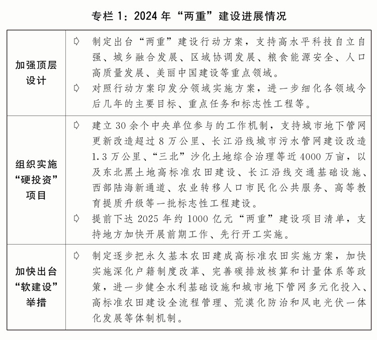 三是加力推進(jìn)“兩重”建設(shè)。進(jìn)一步完善自上而下的工作機(jī)制,加強(qiáng)“兩重”建設(shè)項(xiàng)目儲備,更好統(tǒng)籌“硬投資”與“軟建設(shè)”。安排超長期特別國債8000億元支持“兩重”建設(shè),進(jìn)一步優(yōu)化具體投向并提高項(xiàng)目支持比例,重點(diǎn)支持基礎(chǔ)研究能力提升、未來產(chǎn)業(yè)發(fā)展、東北等重點(diǎn)地區(qū)高標(biāo)準(zhǔn)農(nóng)田建設(shè)、大中型灌區(qū)新建改造及大中型引調(diào)水和大中型水庫建設(shè)、長江經(jīng)濟(jì)帶生態(tài)環(huán)境保護(hù)和綠色發(fā)展、農(nóng)業(yè)轉(zhuǎn)移人口市民化公共服務(wù)體系建設(shè)、高等教育提質(zhì)升級、城市地下管網(wǎng)管廊建設(shè)改造等方面任務(wù),強(qiáng)化超長期貸款等配套融資,高質(zhì)量推進(jìn)“硬投資”項(xiàng)目謀劃實(shí)施。加大力度推動“軟建設(shè)”政策落地見效。