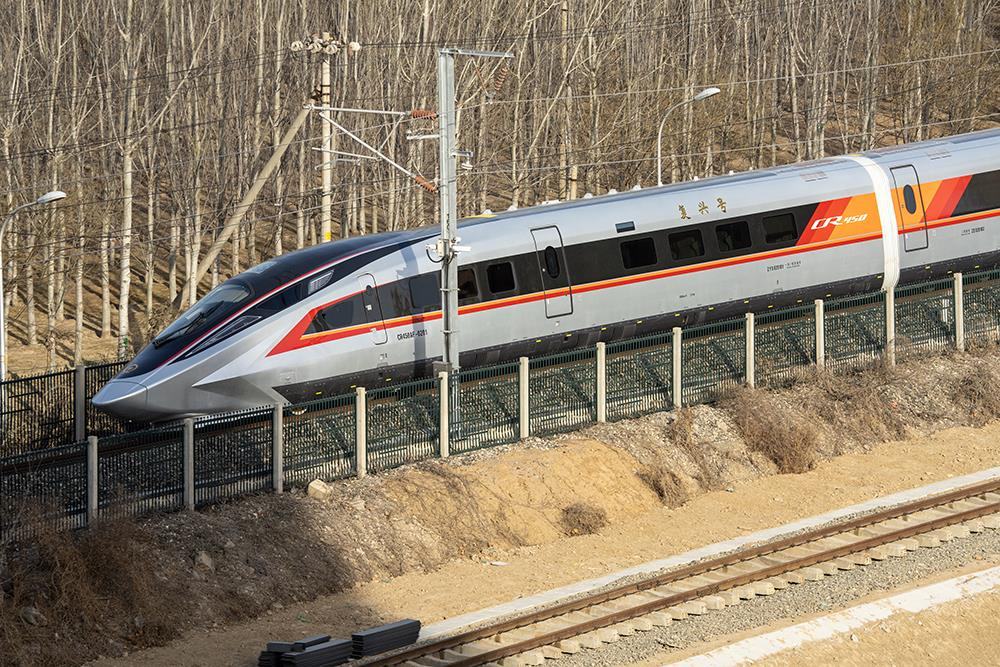 △2025年2月15日,中國(guó)鐵道科學(xué)院試驗(yàn)中心環(huán)形試驗(yàn)場(chǎng),復(fù)興號(hào)CR450型電力動(dòng)車組進(jìn)場(chǎng)展開(kāi)測(cè)試。
