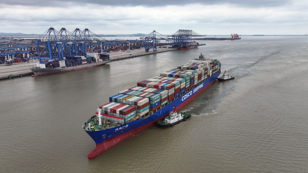 2024年5月19日,一艘海輪在廣西欽州港碼頭靠泊(無人機照片)。欽州港是北部灣港的組成部分,也是中國西南地區(qū)通往東盟的重要出海口。西部陸海新通道利用鐵路、公路、水運等多種運輸方式,由重慶一路向南,經(jīng)廣西北部灣出海通達世界各地。截至2025年1月1日,北部灣港總航線達80條,其中外貿(mào)航線49條,基本實現(xiàn)國內(nèi)主要港口和東南亞、東北亞主要港口全覆蓋。