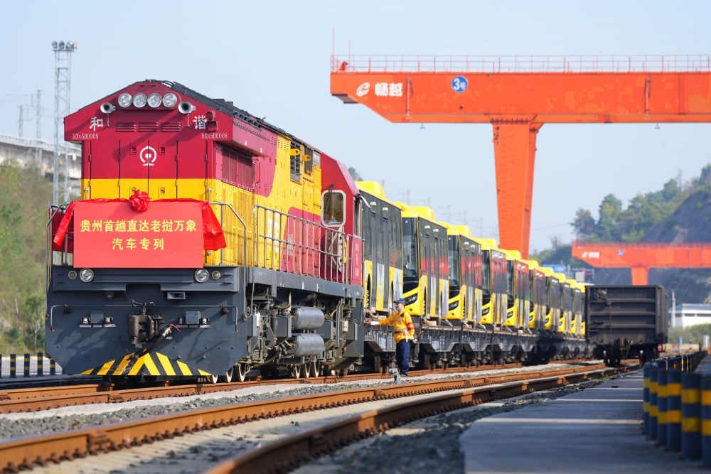 2024年10月28日,裝載著28輛“貴州造”新能源客車的出口專列??吭谫F陽國際陸港都拉營站,準備經(jīng)由云南磨憨口岸出境前往老撾萬象。這是貴州的中老班列首次整列直發(fā),也是貴州本土生產(chǎn)的新能源客車首次出口老撾。