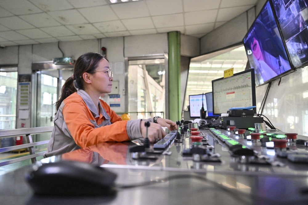 2024年6月13日,在馬來西亞彭亨州馬中關丹產業(yè)園聯(lián)合鋼鐵(大馬)集團公司工廠,中國員工在智能控制室工作。