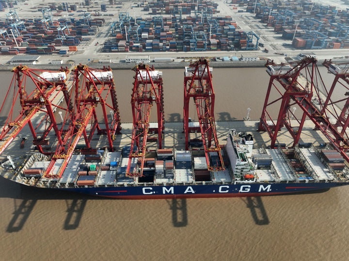 貨輪在浙江寧波舟山港金塘港區(qū)大浦口集裝箱碼頭泊位上裝卸集裝箱(2025年1月4日攝,無人機照片)。新華社發(fā)(鄒訓(xùn)永 攝)