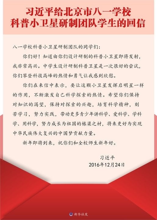 三個多月后,同學們給習近平總書記寫信,報告小衛(wèi)星即將發(fā)射的消息,很快收到了總書記的回信。習近平總書記在回信中說,“你們攀登科技高峰的熱情和勇氣讓我感到欣慰”“希望你們保持對知識的渴望,保持對探索的興趣,培育科學精神,刻苦學習,努力實踐,帶動更多青少年講科學、愛科學、學科學、用科學,努力成長為祖國的棟梁之材”。