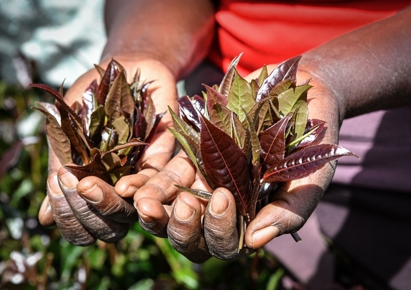 2024年5月6日,在肯尼亞穆拉雅郡的一處紫茶園,茶農(nóng)展示采摘下來的紫茶。新華社記者 韓旭 攝