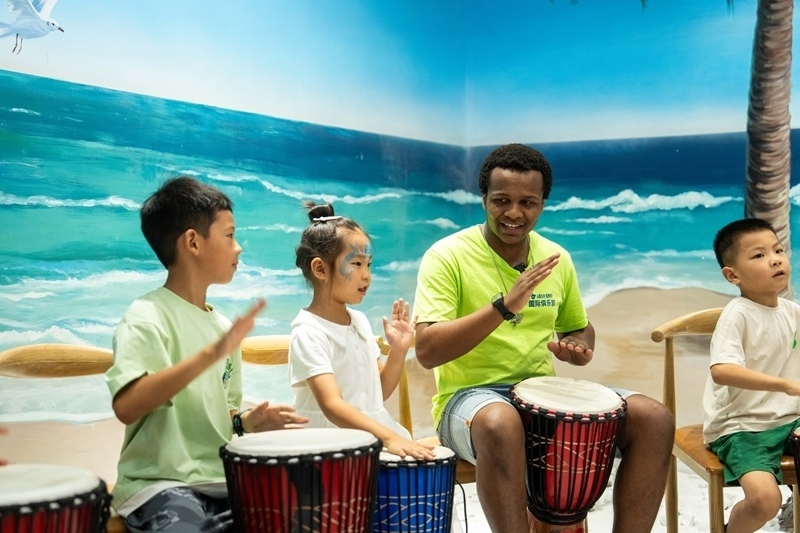 2024年8月30日,在位于湖南高橋大市場的中非經(jīng)貿(mào)博覽會常設(shè)展館安哥拉館,志愿者(右二)帶領(lǐng)學(xué)生學(xué)習(xí)非洲鼓。新華社記者 陳思汗 攝