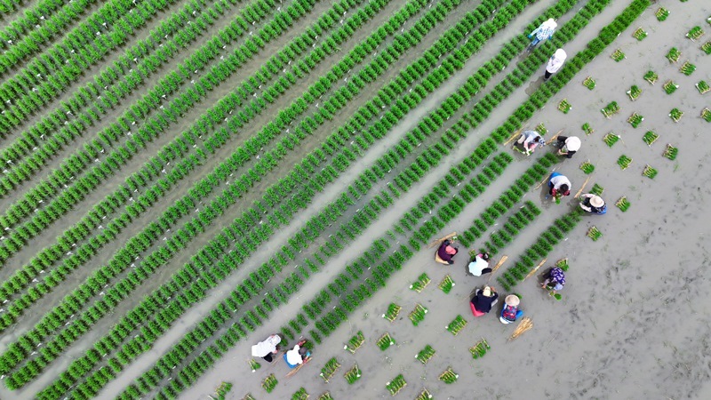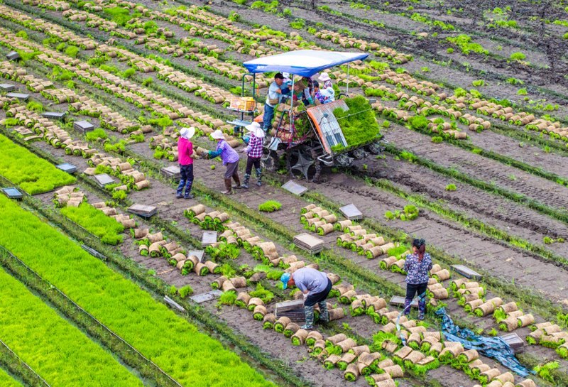 6月14日,在江蘇省興化市陳堡鎮(zhèn)蔣莊村,農(nóng)民在田間將剛起的秧苗裝車(無人機(jī)照片)。