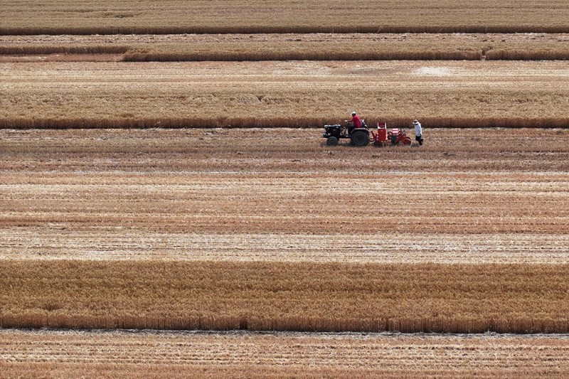 6月10日,在山東省聊城市茌平區(qū)博平鎮(zhèn)任何村,農(nóng)民駕駛農(nóng)機(jī)播種玉米(無人機(jī)照片)。