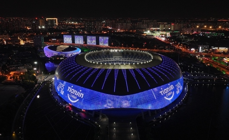 天津奧體中心體育場點亮夏季達沃斯主題燈光(無人機照片,6月20日攝)。