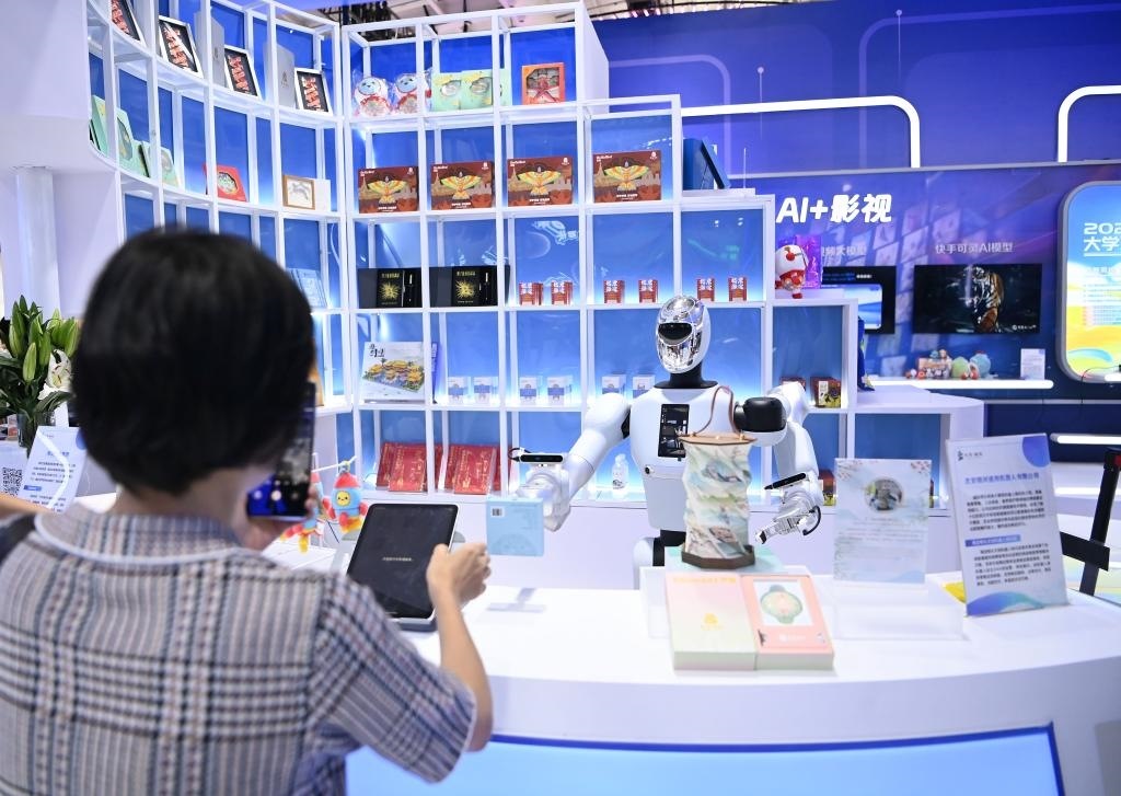 9月11日,在服貿(mào)會文旅服務(wù)專題展區(qū),參觀者在“海淀有禮文創(chuàng)機(jī)器人快閃店”與機(jī)器人互動。新華社記者 肖瀟 攝