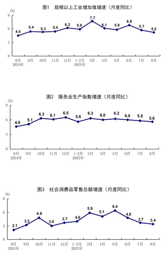 8月份,社會(huì)消費(fèi)品零售總額39668億元,同比增長(zhǎng)3.4%;環(huán)比增長(zhǎng)0.17%。按經(jīng)營單位所在地分,城鎮(zhèn)消費(fèi)品零售額34387億元,同比增長(zhǎng)3.2%;鄉(xiāng)村消費(fèi)品零售額5281億元,增長(zhǎng)4.6%。按消費(fèi)類型分,商品零售額35172億元,增長(zhǎng)3.6%;餐飲收入4496億元,增長(zhǎng)2.1%。基本生活類和部分升級(jí)類商品銷售增勢(shì)良好,限額以上單位日用品類、糧油食品類、體育娛樂用品類商品零售額分別增長(zhǎng)7.7%、5.8%、16.9%。消費(fèi)品以舊換新政策效果繼續(xù)顯現(xiàn),限額以上單位家具類、家用電器和音像器材類、文化辦公用品類、通訊器材類商品零售額分別增長(zhǎng)18.6%、14.3%、14.2%、7.3%。1—8月份,社會(huì)消費(fèi)品零售總額323906億元,同比增長(zhǎng)4.6%。全國網(wǎng)上零售額99828億元,同比增長(zhǎng)9.6%。其中,實(shí)物商品網(wǎng)上零售額80964億元,增長(zhǎng)6.4%,占社會(huì)消費(fèi)品零售總額的比重為25.0%。1—8月份,服務(wù)零售額同比增長(zhǎng)5.1%。其中,文體休閑服務(wù)類、旅游咨詢租賃服務(wù)類、交通出行服務(wù)類零售額較快增長(zhǎng)。