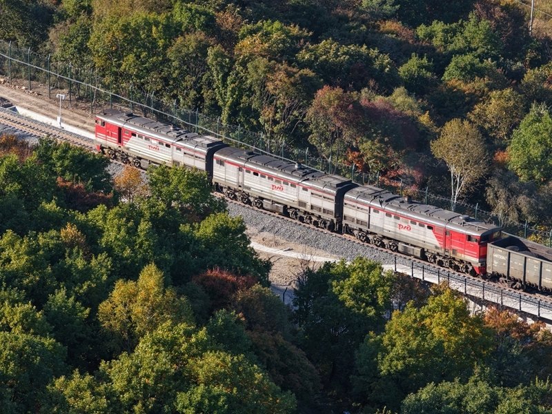 9月27日,滿載大宗品類貨物的入境列車在濱綏鐵路綏芬河至國境線提質(zhì)改造工程新線路上行駛(無人機照片)。