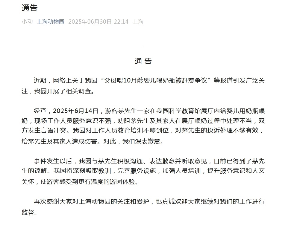 《通告》中稱,經(jīng)查,2025年6月14日,游客茅先生一家在該動物園科學(xué)教育館展廳內(nèi)給嬰兒用奶瓶喂奶,現(xiàn)場工作人員服務(wù)意識不強(qiáng),勸阻茅先生及其家人在展廳喂奶過程中處理不當(dāng),雙方發(fā)生言語沖突。對工作人員教育培訓(xùn)不夠到位,對茅先生的投訴處理不夠有效,給茅先生及其家人造成傷害。對此,上海動物園深表歉意。