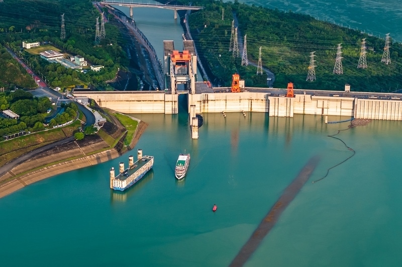 7月1日,在湖北宜昌,船舶有序通過三峽雙線五級船閘和升船機(jī)(無人機(jī)照片)。