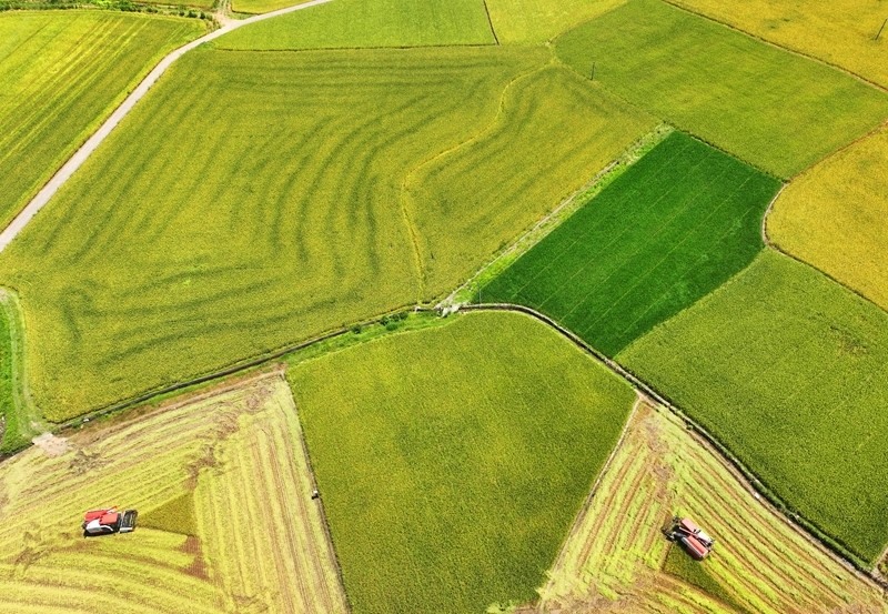7月3日,在湖南省衡陽市衡山縣白果鎮(zhèn),村民駕駛收割機收割早稻(無人機照片)。