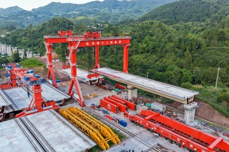 7月5日拍攝的渝萬高鐵江林村特大橋架梁施工作業(yè)現(xiàn)場(無人機(jī)照片)。