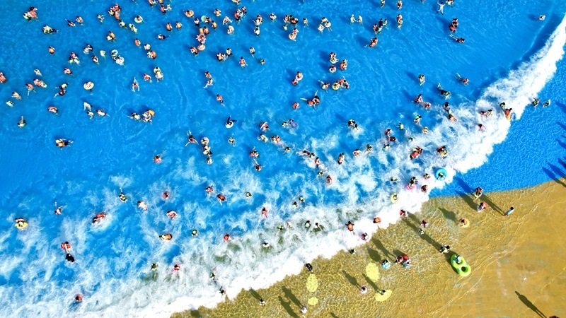 7月5日,浙江省湖州市長興縣太湖圖影旅游度假區(qū)龍之夢樂園嬉水世界,游客親水消暑(無人機(jī)照片)。