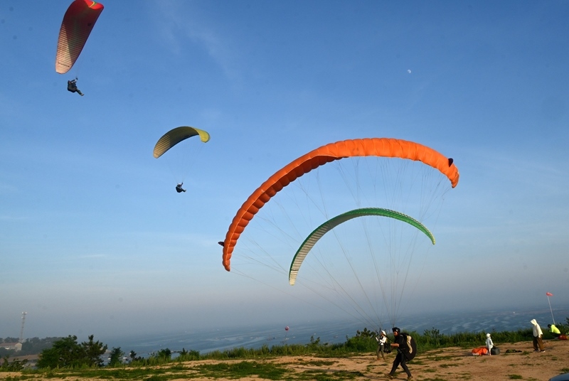 7月5日,游客在山東省榮成市愛倫灣海濱體驗(yàn)滑翔傘運(yùn)動(dòng)。