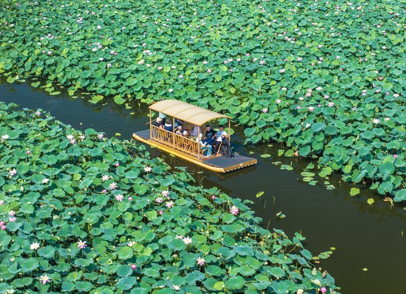 7月6日,游客在江蘇省興化市萬畝荷塘景區(qū)賞荷游玩(無人機(jī)照片)。