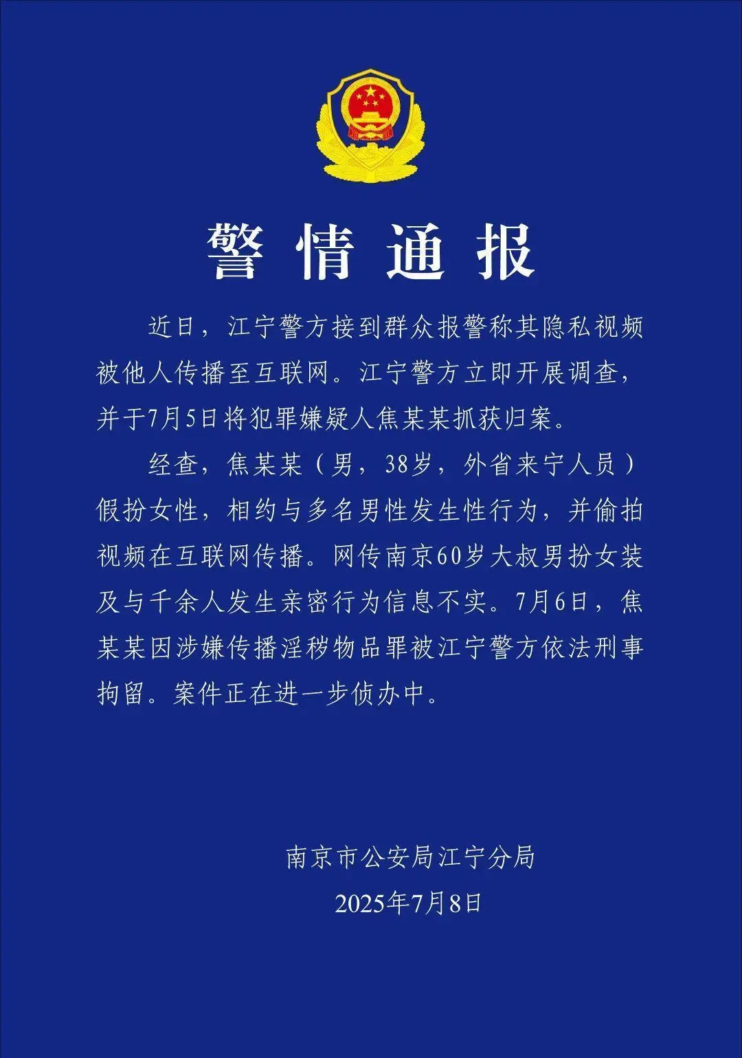 7月8日,南京江寧警方發(fā)布通報(bào)稱,焦某某(男,38歲,外省來(lái)寧人員)假扮女性,相約與多名男性發(fā)生性行為,并偷拍視頻在互聯(lián)網(wǎng)傳播。網(wǎng)傳南京60歲大叔男扮女裝及與千余人發(fā)生親密行為信息不實(shí)。目前,焦某某因涉嫌傳播淫穢物品罪被江寧警方依法刑事拘留。案件正在進(jìn)一步偵辦中。