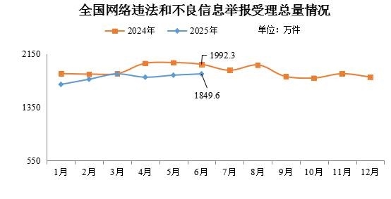 中新網(wǎng)7月9日電 據(jù)“中央網(wǎng)信辦舉報中心”微信公眾號消息,2025年6月,中央網(wǎng)信辦舉報中心指導全國各級網(wǎng)信舉報工作部門、主要網(wǎng)站平臺受理網(wǎng)民舉報色情、賭博、侵權(quán)、謠言等違法和不良信息1849.6萬件,環(huán)比增長1.1%、同比下降7.2%。其中,中央網(wǎng)信辦舉報中心受理舉報39.8萬件,環(huán)比下降9.5%、同比下降15.1%;各地網(wǎng)信舉報工作部門受理舉報63.7萬件,環(huán)比增長6.6%、同比下降50%;全國主要網(wǎng)站平臺受理舉報1746.1萬件,環(huán)比增長1.2%、同比下降4%。