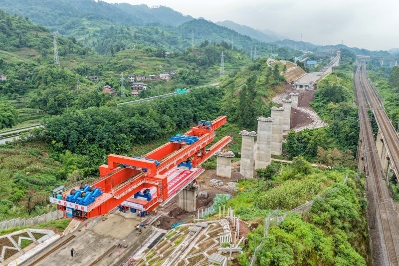 當(dāng)日,中鐵十四局工人將首孔長24.6米、重542噸的箱梁架設(shè)在西渝高鐵重慶段陳家溝特大橋第一孔橋墩上,標(biāo)志著西渝高鐵重慶段箱梁架設(shè)施工正式啟動。