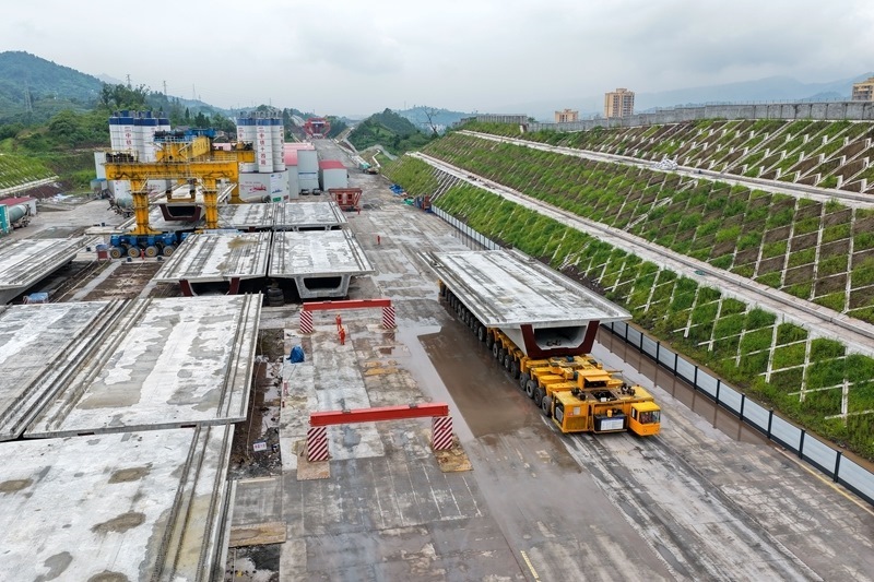 7月10日,在西渝高鐵陳家溝特大橋附近的制梁場,運梁機在進(jìn)行箱梁轉(zhuǎn)運作業(yè)。