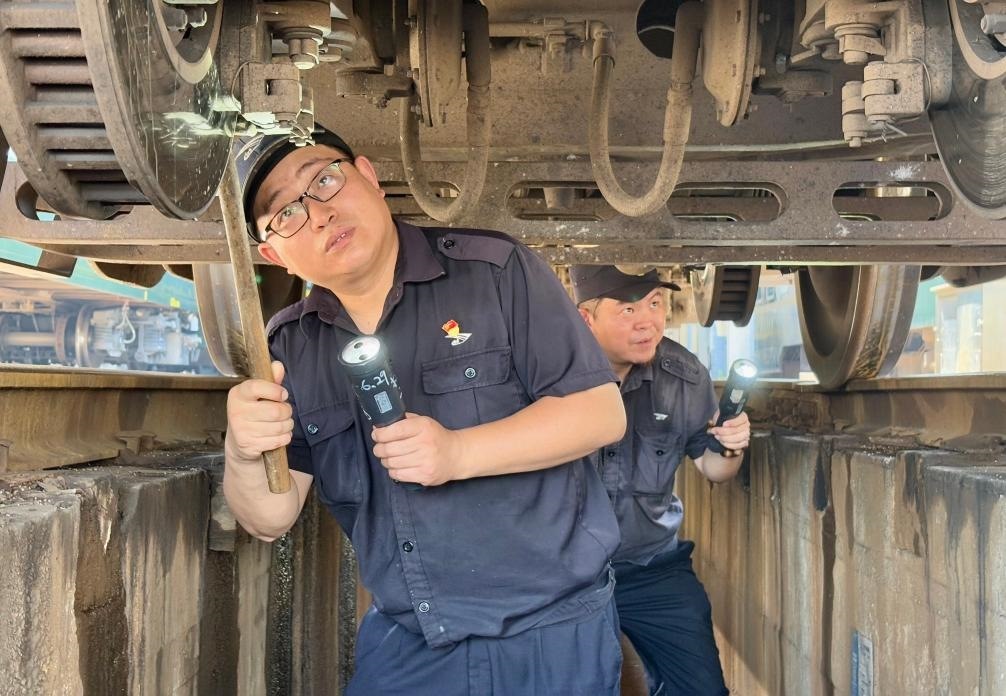 只見(jiàn)他俯下身鉆入車(chē)底,仔細(xì)檢查車(chē)輛的轉(zhuǎn)向架、制動(dòng)裝置等關(guān)鍵部位。車(chē)底空間狹小、光線不足,許立業(yè)需借助手電筒弓著腰作業(yè),不一會(huì)兒,汗水就浸濕了工作服。為了預(yù)防中暑,他掏出一瓶藿香正氣水,一口氣喝完,然后擦了擦臉上的汗水,繼續(xù)朝下節(jié)車(chē)廂走去。