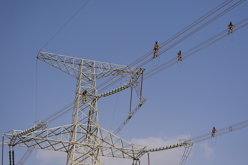 施工人員在且末-若羌750千伏線路開展走線消缺工作(6月24日攝)。