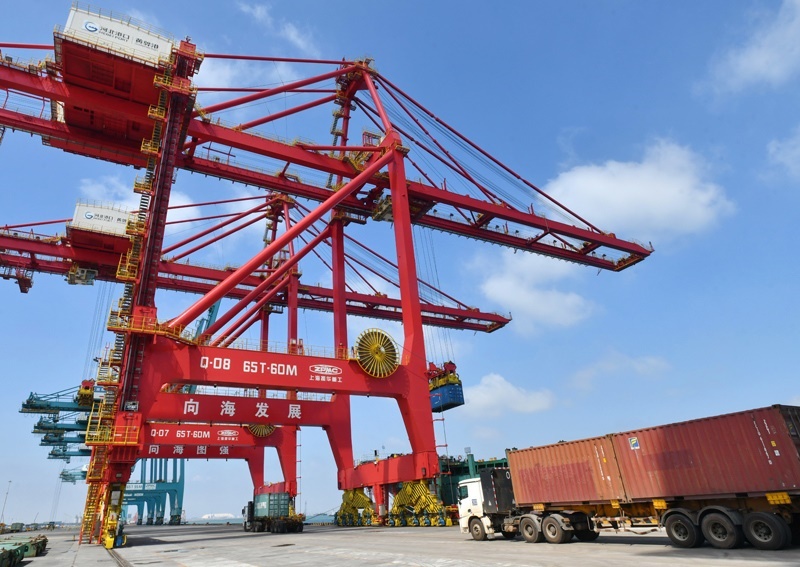 7月16日,工人在黃驊港綜合港區(qū)集裝箱碼頭操作吊裝設備進行裝船作業(yè)。
