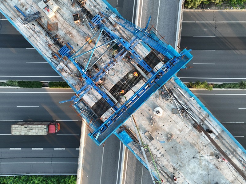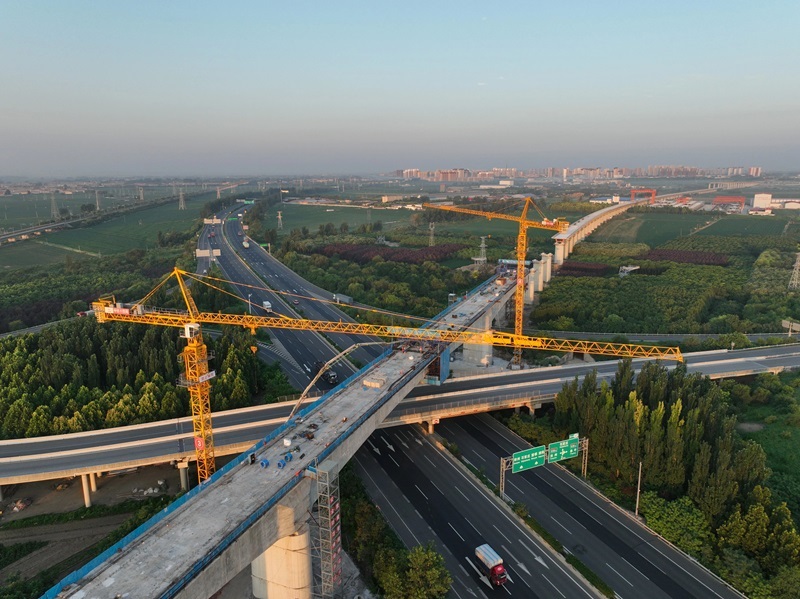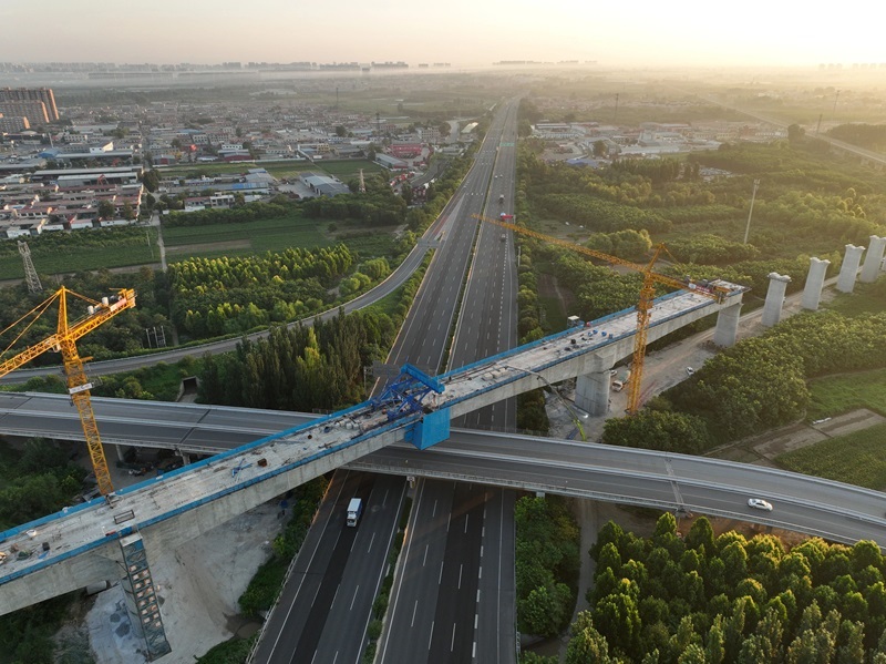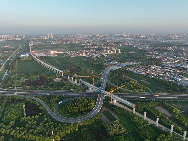 7月18日拍攝的雄忻高鐵保定東特大橋跨京港澳高速連續(xù)梁中跨施工現(xiàn)場(無人機照片)。
