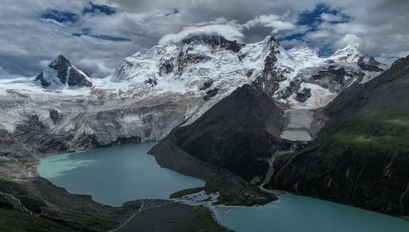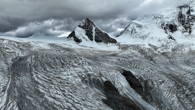 7月19日拍攝的薩普雪山及延伸的冰川(無(wú)人機(jī)照片)。