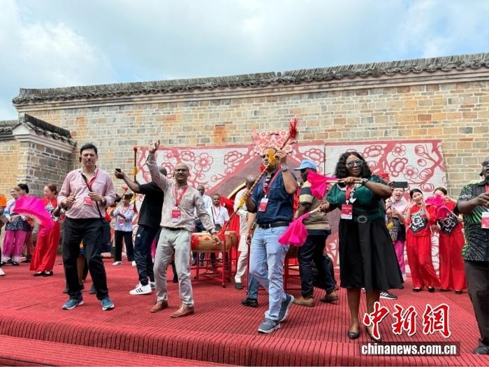 中新網(wǎng)7月21日電(記者 黃方) 鼓聲“咚咚咚”在江西贛州龍南市關(guān)西新圍響起,非洲記者大會秘書長威廉·奧洛首次嘗試舞龍。他興奮地搖動著龍頭,跟隨節(jié)奏躍動,忍不住連聲贊嘆:“這太有節(jié)奏感了!”