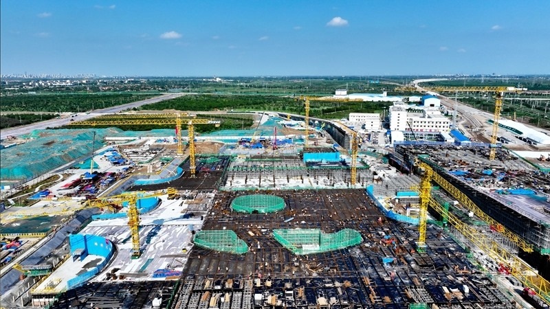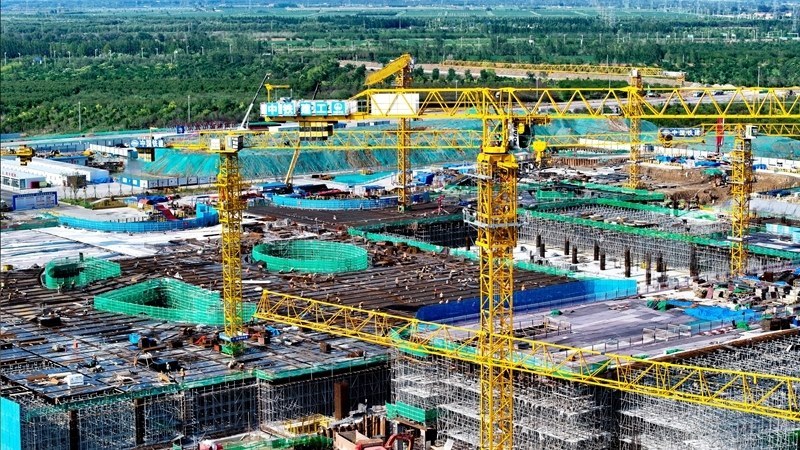 7月25日,在津?yàn)H高鐵山東東營(yíng)高鐵站現(xiàn)代綜合客運(yùn)樞紐及配套工程建設(shè)現(xiàn)場(chǎng),中鐵二十局工作人員在施工(無人機(jī)照片)。