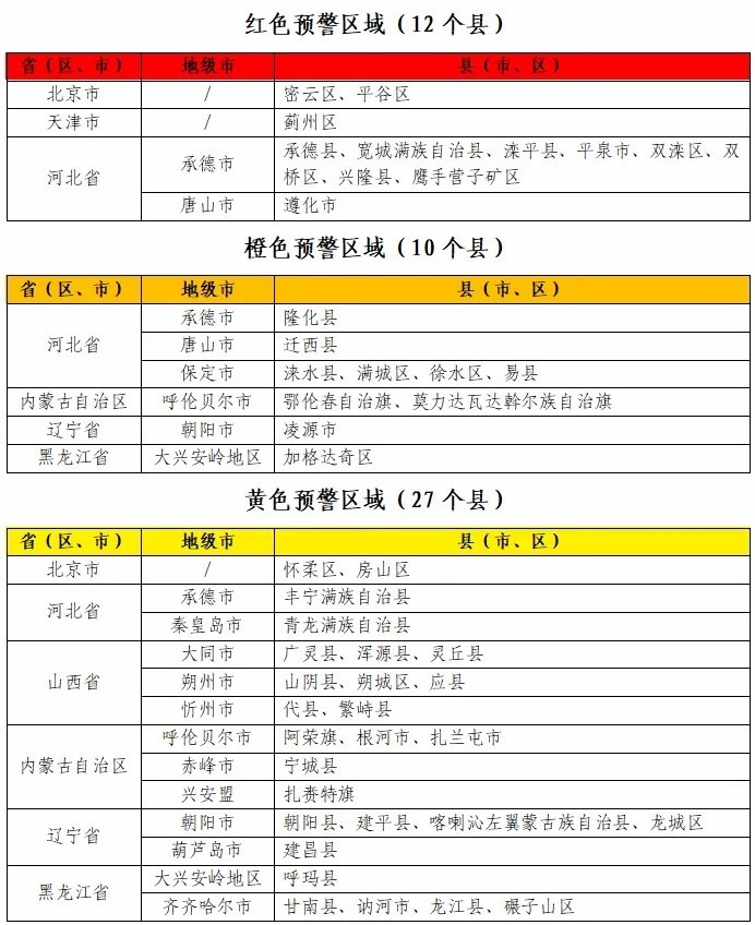 據(jù)“中國(guó)水利”微信公眾號(hào)消息,水利部和中國(guó)氣象局7月28日18時(shí)聯(lián)合發(fā)布紅色山洪災(zāi)害氣象預(yù)警:預(yù)計(jì),7月28日20時(shí)至7月29日20時(shí),北京東部、天津北部、河北中部和東北部、內(nèi)蒙古東北部、遼寧西部、黑龍江西部等地部分地區(qū)發(fā)生山洪災(zāi)害可能性大(橙色預(yù)警),其中,北京東部、天津北部、河北東北部局地發(fā)生山洪災(zāi)害可能性很大(紅色預(yù)警),預(yù)警區(qū)域涉及的縣(市、區(qū))見(jiàn)下表。其他地區(qū)也可能因局地短歷時(shí)強(qiáng)降水引發(fā)山洪災(zāi)害,請(qǐng)各地注意做好實(shí)時(shí)監(jiān)測(cè)、防汛預(yù)警和轉(zhuǎn)移避險(xiǎn)等防范工作。