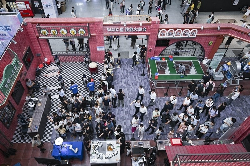 這是7月29日拍攝的“WAIC里技能大舞臺”,多款機器人在此進行技能展示。