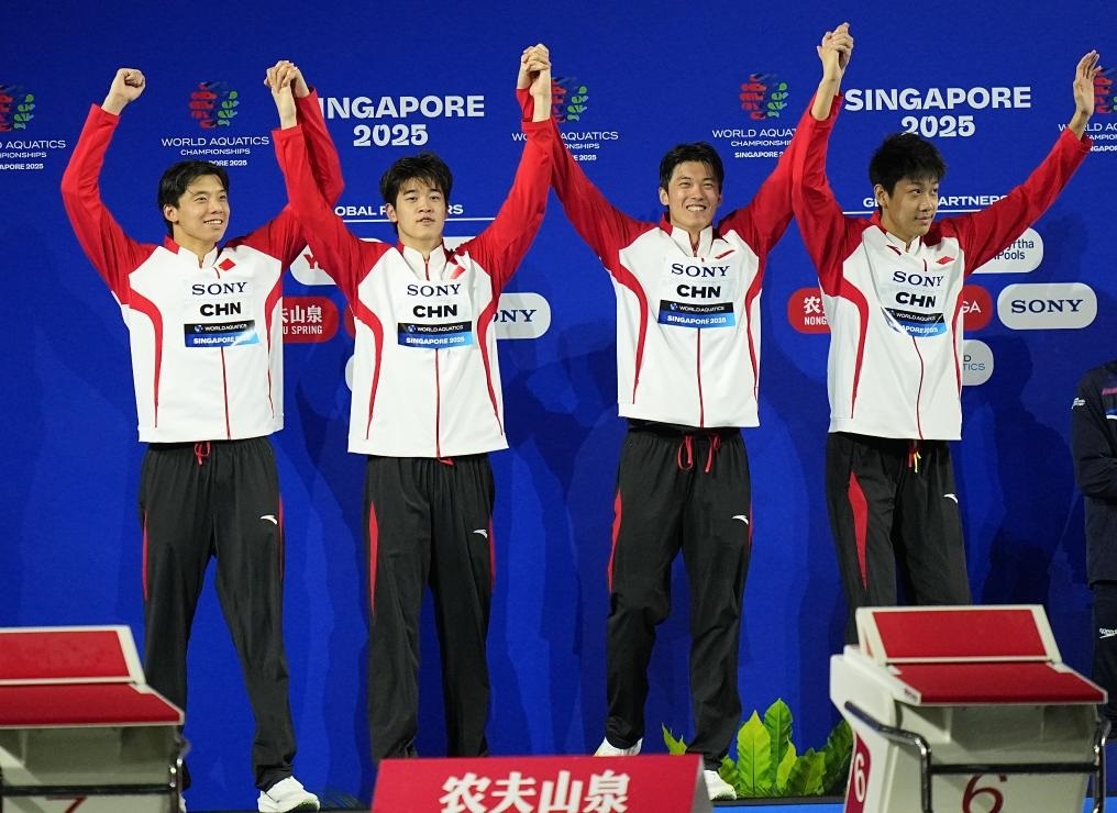 8月1日,由季新杰、潘展樂(lè)、汪順、張展碩(從左至右)組成的中國(guó)隊(duì)在頒獎(jiǎng)儀式上。新華社記者 夏一方 攝