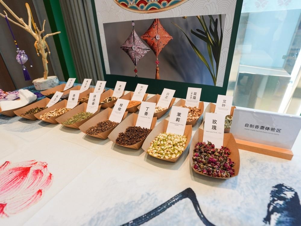 這是8月3日在成都世運(yùn)會運(yùn)動員村A區(qū)中醫(yī)藥體驗(yàn)館拍攝的自制香囊體驗(yàn)區(qū)。新華社記者 王曦 攝