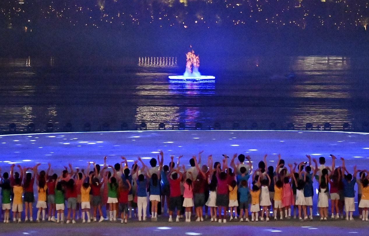 宣布開(kāi)幕瞬間,象征世運(yùn)會(huì)會(huì)徽和“World”的“W”造型焰火點(diǎn)亮夜空;極具創(chuàng)意和挑戰(zhàn)的點(diǎn)火儀式,火炬“竹夢(mèng)”成功點(diǎn)燃世運(yùn)會(huì)首個(gè)“水火相融”于湖中的火炬塔,絢爛的火焰交相輝映。