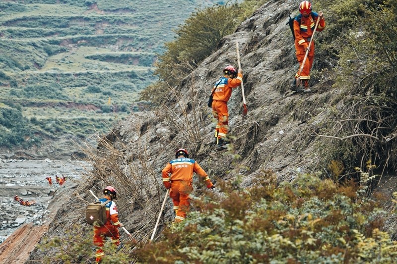 8月9日,國家西北區(qū)域應急救援中心指戰(zhàn)員在馬坡鄉(xiāng)舊莊溝村攜帶搜救犬配合大型機械搜救失聯人員。