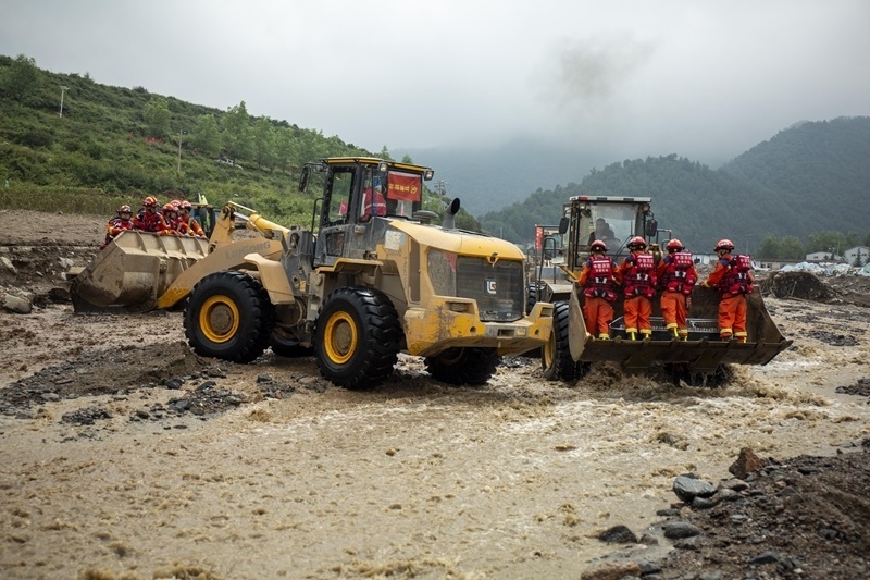 8月9日,國家西北區(qū)域應急救援中心指戰(zhàn)員在馬坡鄉(xiāng)舊莊溝村依托大型機械渡河開展搜救工作。