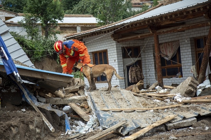 8月9日,甘肅省森林消防總隊消防員在榆中縣馬坡鄉(xiāng)舊莊溝村利用搜救犬搜救。