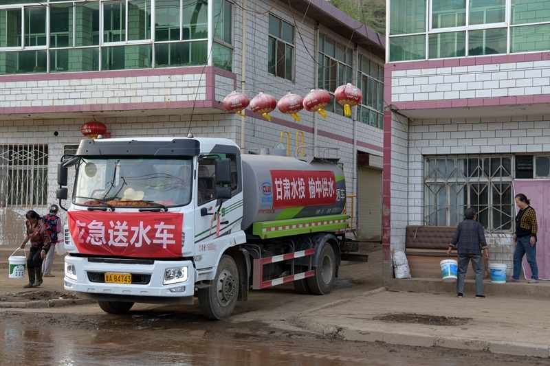8月11日,在榆中縣城關(guān)鎮(zhèn)興隆山村,當(dāng)?shù)厮畡?wù)部門為村民送去飲用水。