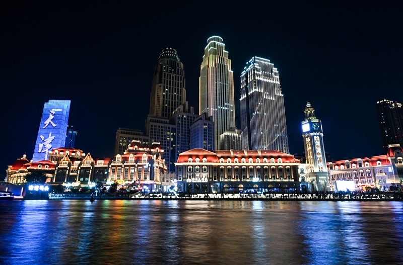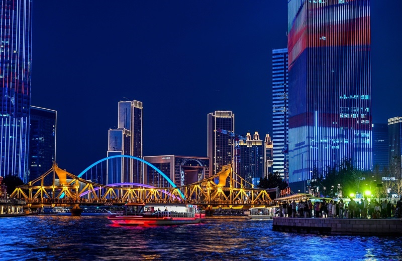 夜幕降臨,海河兩岸燈光璀璨絢麗,熱鬧非凡。市民和游客在天津海河畔漫步休閑,消暑納涼,領(lǐng)略城市光影之美。