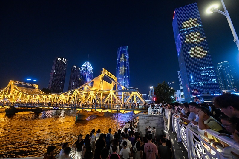 8月11日,市民游客在天津海河解放橋上欣賞城市夜景。