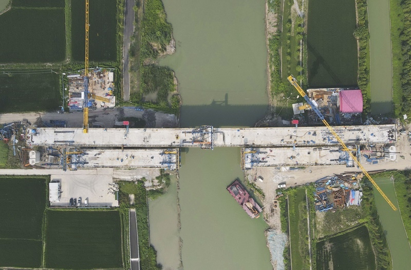 8月12日拍攝的滬寧合高鐵上海特大橋跨羅蘊(yùn)河連續(xù)梁施工現(xiàn)場(chǎng)(無(wú)人機(jī)照片)。